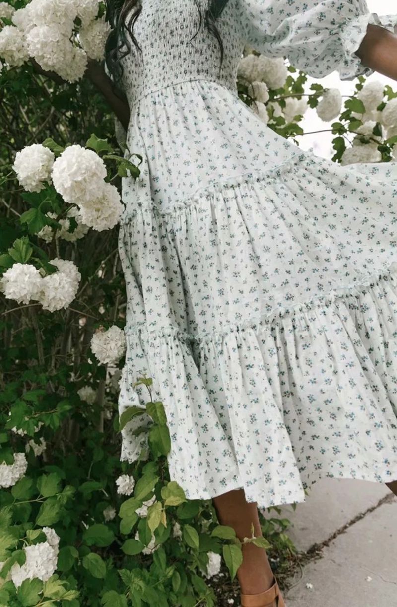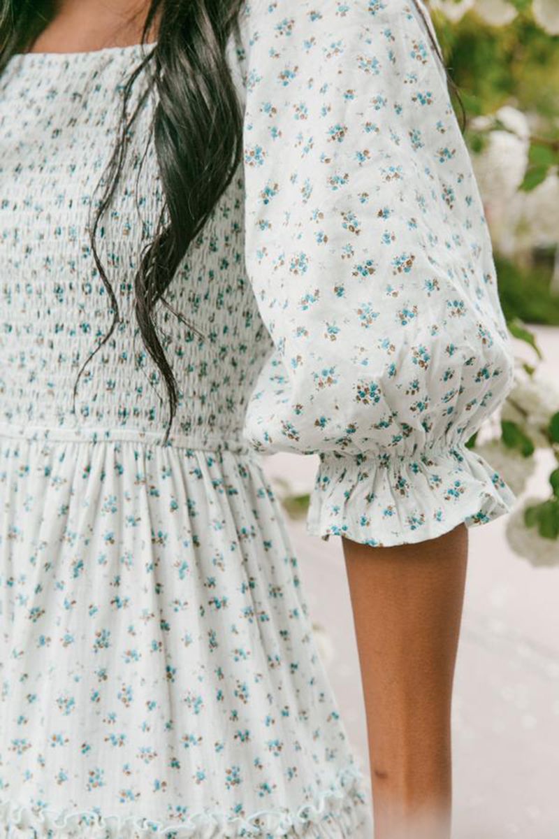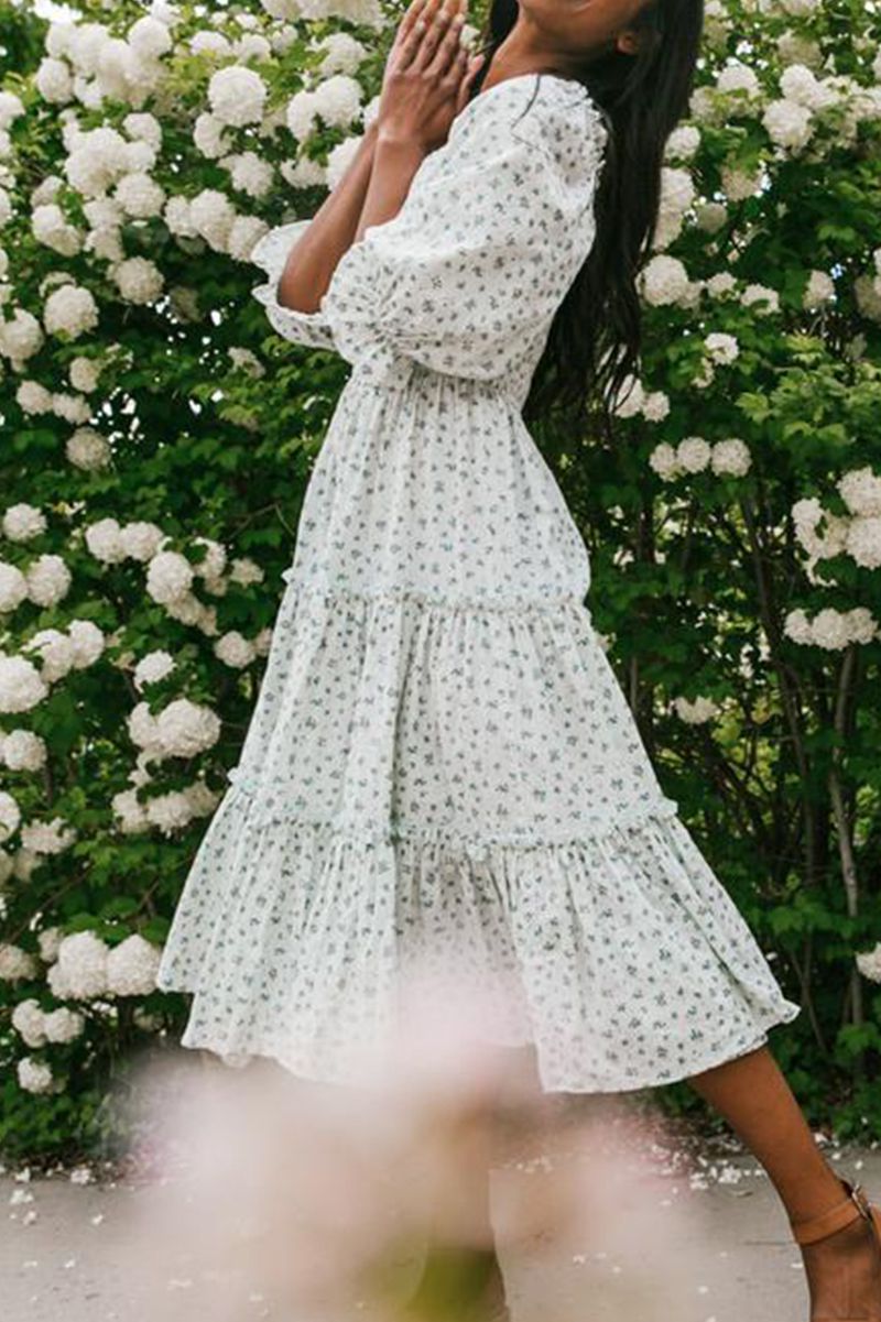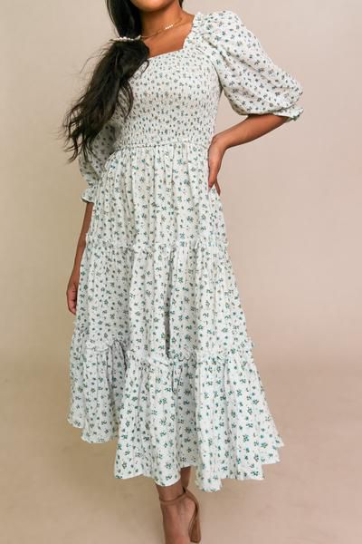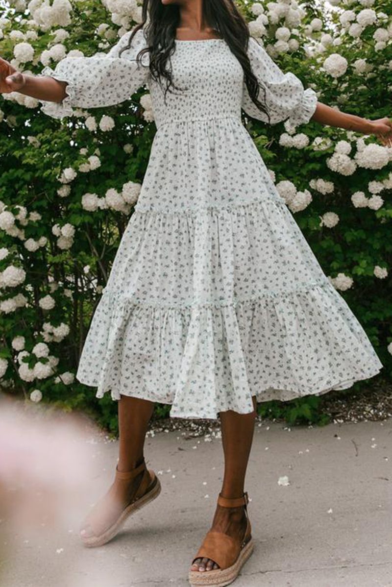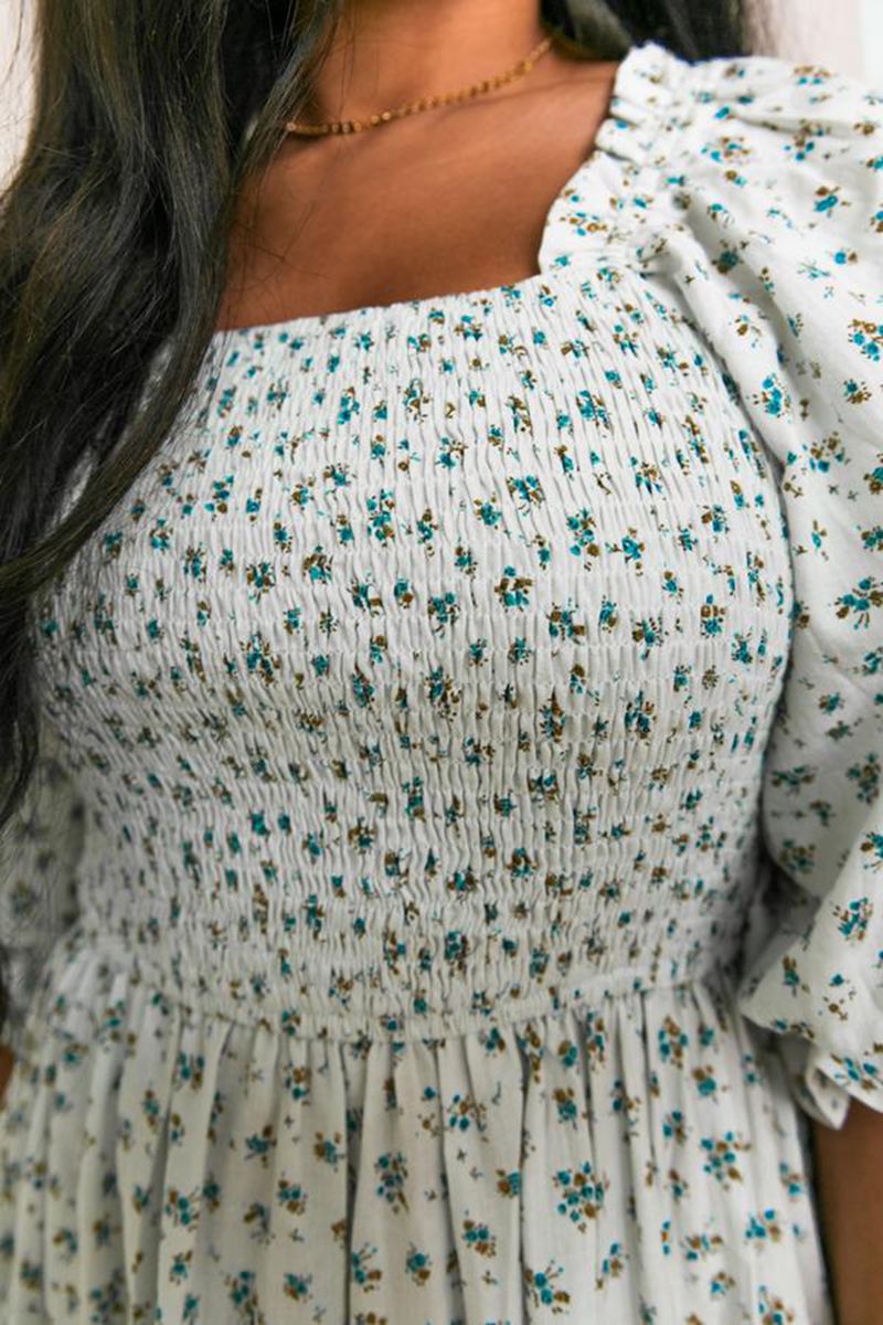 Ditsy Micro Floral Smocked Bodice Ruffle Midi Dress Puff Sleeve