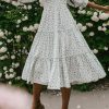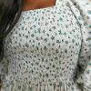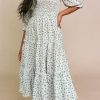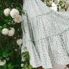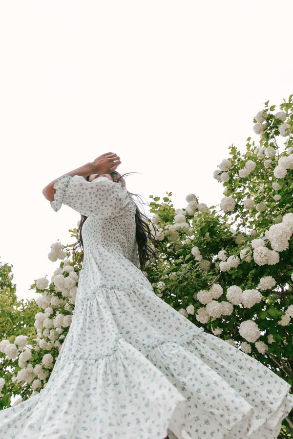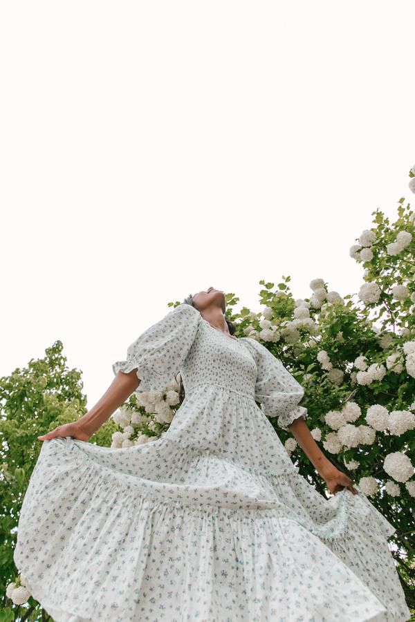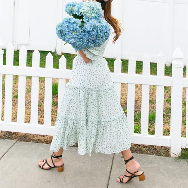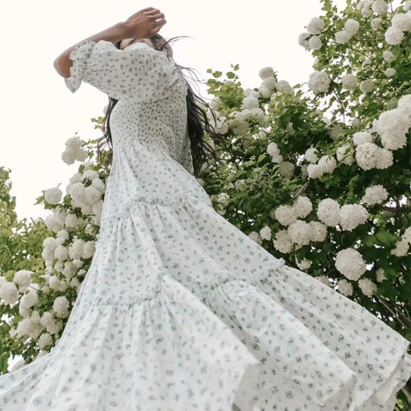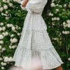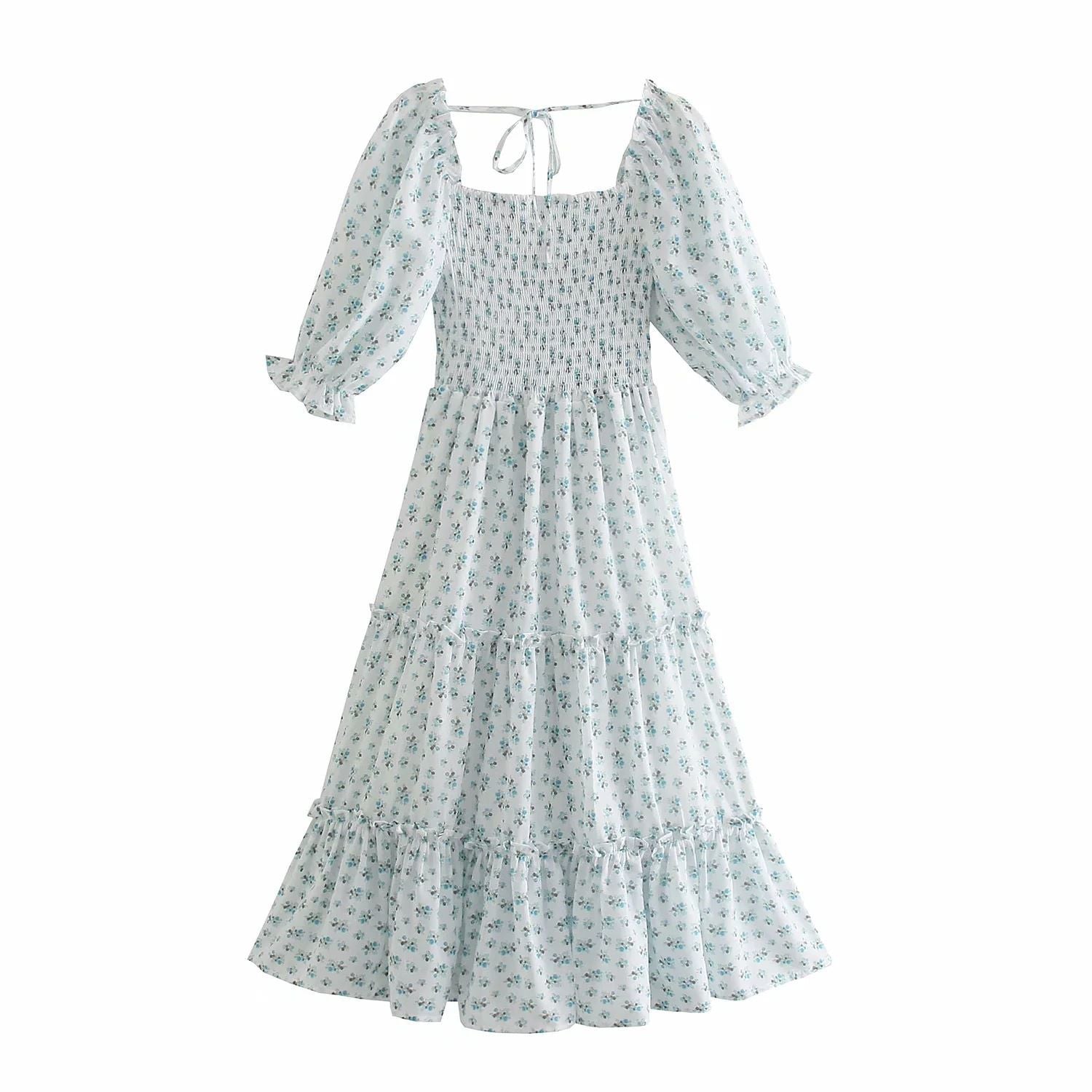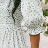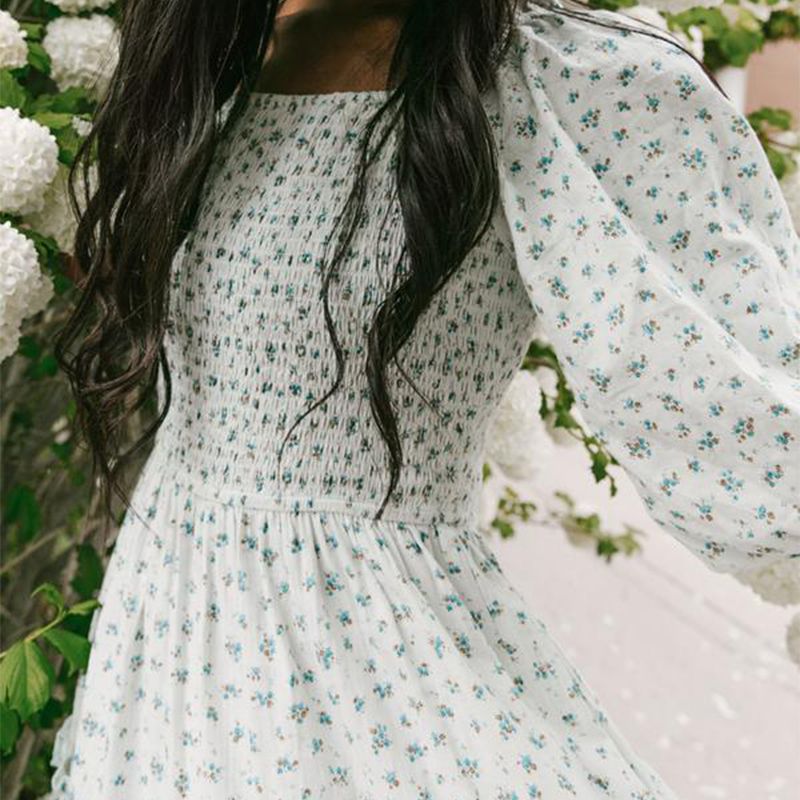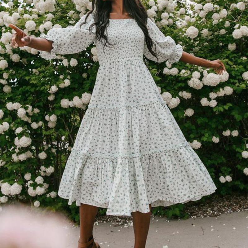 Ditsy Micro Floral Smocked Bodice Ruffle Midi Dress Puff Sleeve
